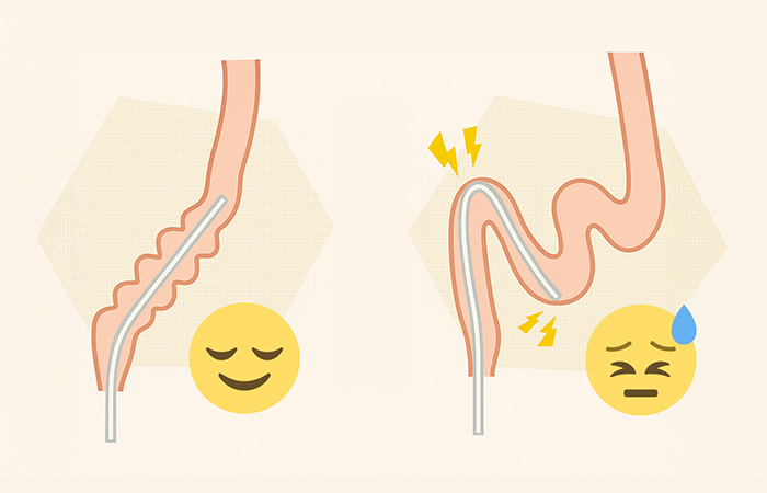 当院では、軸保持短縮法という手技を用い、腸を無理に伸ばすことなく、腸のループを丁寧にたたみ込むように短縮して挿入することで、痛みを最小限に抑える検査を行っています。